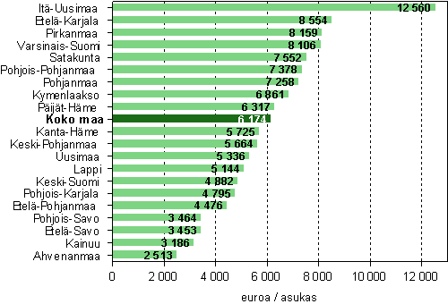 Maakunnan jalostusarvo jaettuna maakunnan asukasluvulla koko teollisuudessa vuonna 2004 (euroa)
