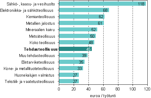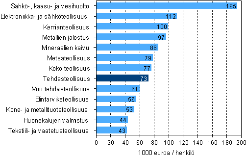 Elektroniikka- ja sähköteollisuudessa jalostusarvo palkattua henkilöä kohden oli 112 259 euroa, laskua edellisvuodesta oli 11 064 euroa. Kemianteollisuudessa työn tuottavuus oli 99 982 euroa, nousua vuodesta 2003 oli 20 723 euroa. Myös metallien jalostuksessa jalostusarvo palkattua henkilöä kohden (96 875 euroa) kasvoi 19 467 eurolla edellisvuodesta. Jalostusarvo jaettuna henkilöstön lukumäärällä oli keskimääräistä pienempää kone- ja metallituoteteollisuudessa (53 145 euroa), huonekalujen valmistuksessa (44 253 euroa) sekä tekstiili- ja vaatetusteollisuudessa (43 007 euroa).