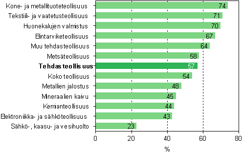 Henkilöstökulujen osuus jalostusarvosta oli tehdasteollisuudessa 57 prosenttia vuonna 2004. Suurimmat henkilöstökulujen osuudet jalostusarvosta olivat työvoimavaltaisilla aloilla kuten kone- ja metallituoteteollisuudessa, tekstiili- ja vaatetusteollisuudessa ja huonekalujen valmistuksessa.