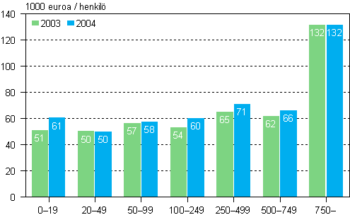 100-249 henkilöä työllistävissä toimipaikoissa tuottavuus nousi myös 13 prosenttia henkilöstön määrän pysyessä lähes samana kuin vuonna 2003. 250-499 henkilöä työllistävissä toimipaikoissa tuottavuus kasvoi 9,5 prosenttia, kun henkilöstön määrä väheni 7 prosenttia. 500-749 henkilöä työllistävissä toimipaikoissa tuottavuus kohosi myös lähes 7 prosenttia henkilöstön määrän kasvaessa vajaat 15 prosenttia.
