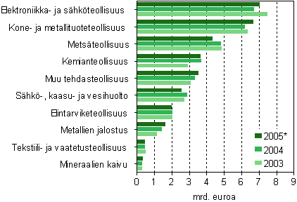 Teollisuustuotannon (C, D, E) jalostusarvo kasvoi ennakkotietojen mukaan 1,3 prosenttia yltäen noin 33 miljardiin euroon vuonna 2005. Mineraalien kaivussa jalostusarvo lisääntyi vajaat 13 prosenttia. Tehdasteollisuuden tuotannon jalostusarvo kasvoi runsaat 2 prosenttia yltäen 29,6 miljardiin euroon.