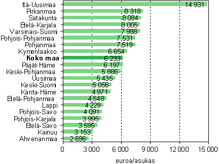 Maakunnan jalostusarvo jaettuna maakunnan asukasluvulla teollisuudessa (C, D, E) vuonna 2005* (euroa)