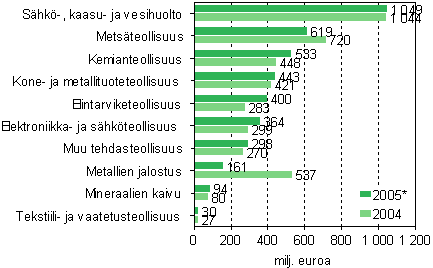 Investoinnit yhteensä teollisuudessa vuosina 2004 ja 2005* (milj. euroa)