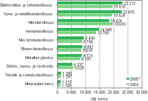 Tuotannon bruttoarvo teollisuudessa 2004 ja 2005* (mrd. euroa)