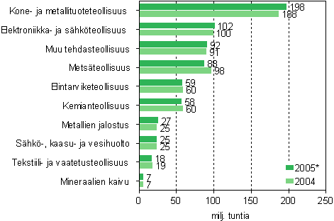 Tehdyt työtunnit teollisuudessa vuosina 2004 ja 2005* (milj. tuntia)