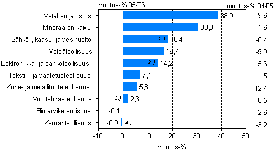 Koko teollisuuden tuotannon arvo kasvoi yli 10 prosenttia Tilastokeskuksen ennakkotietojen mukaan jalostusarvolla mitattuna vuonna 2006. Tehdasteollisuuden jalostusarvo lisääntyi yli 9 prosenttia edellisvuodesta. Kaivostoiminnan jalostusarvo kasvoi ripeästi, lähes 31 prosenttia vuotta aiemmasta. Sähkö-, kaasu- ja vesihuollon jalostusarvo lisääntyi myös yli 18 prosenttia. Koko teollisuuden palkatun henkilöstön määrä kasvoi hieman, lisäystä edellisvuodesta oli vajaan prosentin. Käyttöomaisuuden investoinnit vähenivät koko teollisuudessa runsaat 2 prosenttia vuonna 2006.