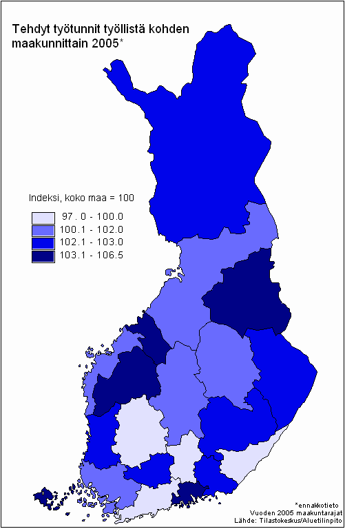 Tehdyt työtunnit työllistä kohden maakunnittain 2005*, koko maa = 100