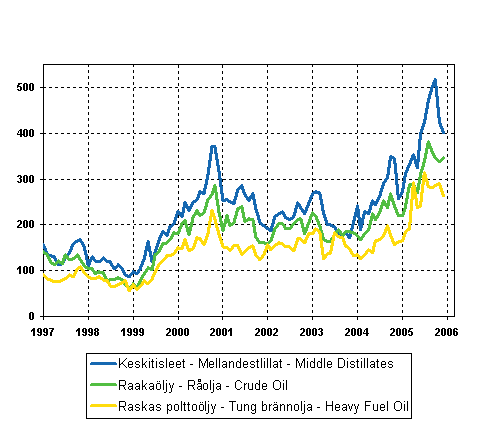 Kuvio 7. Öljyn tuontihinnat 1997-, €/t