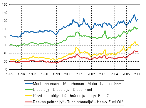 Kuvio 8. Tärkeimpien öljytuotteiden kuluttajahinnat 1995-, c/l