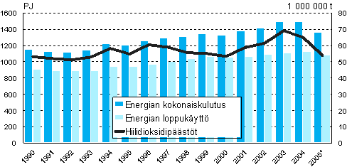 Tilastokeskuksen ennakkotietojen mukaan energian kokonaiskulutus oli vuonna 2005 1360 petajoulea, mikä oli lähes 9 prosenttia vähemmän kuin edellisvuonna. Sähköä käytettiin 85 TWh eli yli 2 prosenttia vähemmän kuin vuonna 2004. Energian tuotannon ja käytön hiilidioksidipäästöt alenivat 17 prosenttia verrattuna vuotta aiempiin päästöihin. Energian kokonaiskulutus ja päästöt vähenivät, koska sähkön lauhdetuotanto putosi kolmannekseen edellisvuoden korkealta tasolta ja sähkön nettotuonti nousi ennätyskorkeaksi. Sähkön kulutuksen väheneminen johtui teollisuuden pienentyneestä energiantarpeesta.