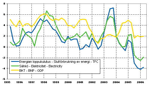 Kuvio 01. Bruttokansantuotteen, energiankulutuksen ja sähkönkulutuksen muutokset 1995-, %