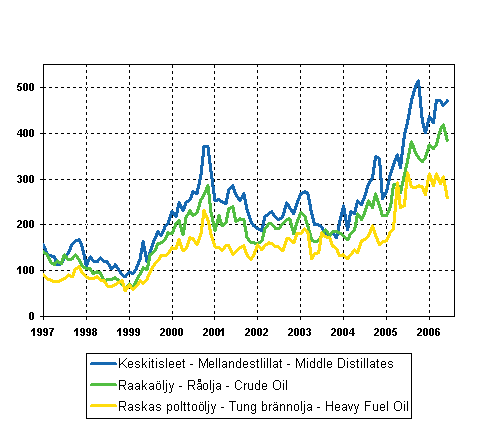 Figur 07. Importpriser på olja 1997-, €/t