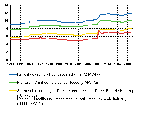 Kuvio 11. Sähkön hinta kuluttajatyypeittäin 1994-, c/kWh
