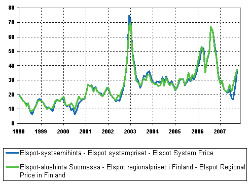 ISSN=1798-338X. 3rd quarter 2007, Figure 12. Average Monthly SpotPrices at the Nord Pool Power Exchange 1998-, €/MWh . Helsinki: Statistics Finland [referred: 20.11.2025].