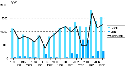 Ennakko 2007: Sähkön tuonti ja vienti 1990-2007