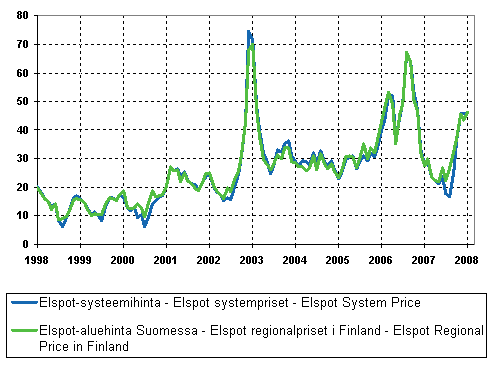 Kuvio 12. Nord pool -sähköpörssin kuukausikeskiarvot 1998-, €/MWh