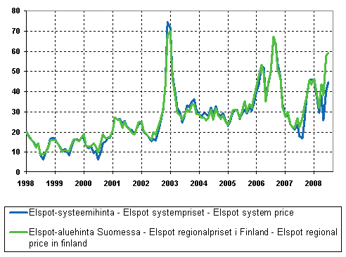 Kuvio 12. Nord Pool -sähköpörssin kuukausikeskiarvot 1998-, €/MWh