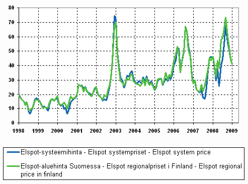 Figure 12. Average monthly spotprices at the Nord Pool power exchange 1998-, €/MWh