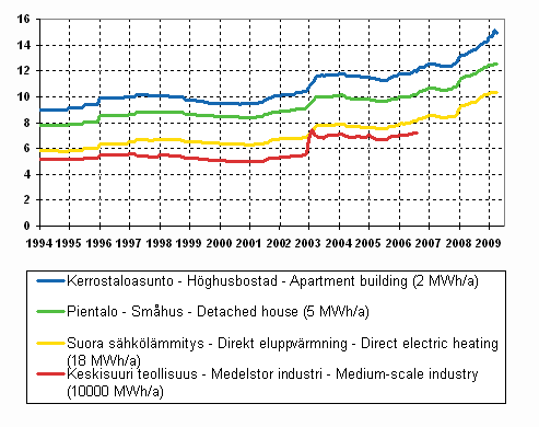 Kuvio 11. Sähkön hinta kuluttajatyypeittäin 1994-, c/kWh