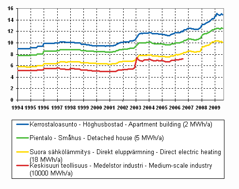 Figur 11. Pris på elektricitet enligt konsumenttyp 1994-, c/kWh