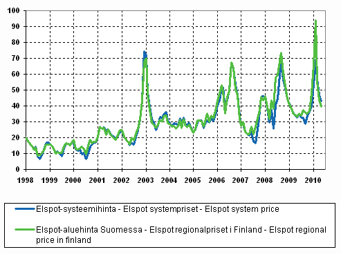 Figur 12. Månadsmedelvärdena för spot-priserna vid elbörsen Nord Pool 1998-, €/MWh
