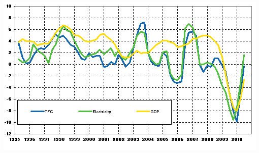 - Appendix figure 01. Changes in GDP, Final energy consumption and electricity consumption 1995-, % (23.9.2010)