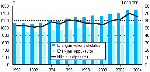 Energian kokonaiskulutus, loppukulutus ja hiilidioksidipäästöt 1990-2004