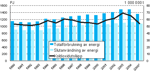 Enligt Statistikcentralens preliminära uppgifter uppgick totalförbrukningen av energi till 1 360 petajoule år 2005, vilket är nästan 9 procent mindre än året innan. Totalt användes 85 TWh elektricitet, dvs. mer än 2 procent mindre än år 2004. Koldioxidutsläppen från energiproduktionen och förbrukningen sjönk med 17 procent från året innan. Totalförbrukningen av energi och utsläppen minskade eftersom produktionen av kondensel sjönk till en tredjedel av den höga nivån året innan och nettoimporten av el steg till en rekordhög nivå. Nedgången i elförbrukningen berodde på det minskade energibehovet inom industrin.