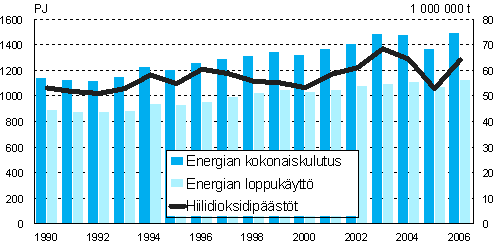 Energian kokonaiskulutus, loppukäyttö ja hiilidioksidipäästöt 1990-2006