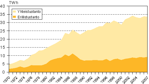 Kaukolämmön tuotanto 1970-2007