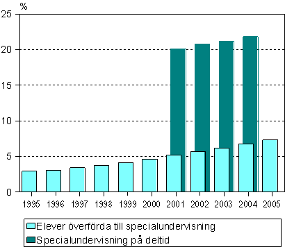 Andelen grundskoleelever som förts över till specialundervisning resp. fick specialundervisning på deltid av alla grundskoleelever 1995-2005, % 1)