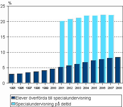 Hösten 2008 hade drygt åtta procent av grundskoleleverna, dvs. 47 300 elever, flyttats till specialundervisning. Även om antalet grundskoleelever minskade, ökade antalet elever som flyttats till specialundervisning med 1 200 från året innan. Ökningen har pågått i mer än tio år. Under läsåret 2007-2008 fick 22 procent av eleverna, dvs. 126 300 grundskolelever, specialundervisning på deltid. Antalet elever i specialundervisning på deltid minskade med 2 400 från läsåret innan. Uppgifterna framgår av Statistikcentralens utbildningsstatistik.