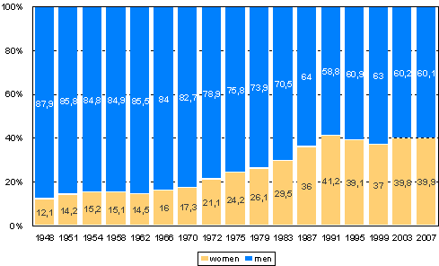 Women and men as percentage of candidates in Parliamentary elections in 1948 - 2007 (%)
