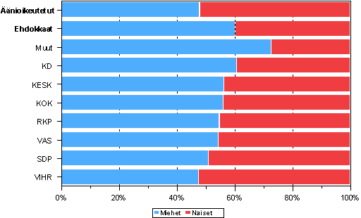 Vaaleissa asetettiin 2 004 ehdokasta, joista miehiä oli 1 205 ja naisia 799. Suurista puolueista suhteellisesti vähiten naisehdokkaita on Kristillisdemokraateilla (39,4 %) ja Suomen Keskustalla (43,8 %). Eniten naisehdokkaita on Vihreillä (52,5 %) ja SDP:llä (49,1 %). Vain Vihreillä on enemmän nais- kuin miesehdokkaita. Äänioikeutetuista naisia on enemmistö eli 52 prosenttia.