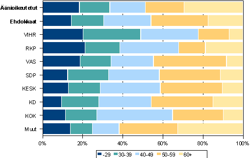 Vihreillä on eniten alle 40-vuotiaita ehdokkaita, miltei puolet. Myös RKP:llä ja Vasemmistoliitolla on enemmän alle 40-vuotiaita ehdokkaita kuin äänioikeutetuissa. Vähiten nuoria ehdokkaita on Kristillisdemokraateilla ja Kokoomuksella. Kokoomuksella on eniten 40-49-vuotiaita ehdokkaita, Vasemmistoliitolla, Suomen Keskustalla ja Kristillisillä ehdokkaina on eniten 50-59-vuotiaita. 60-vuotta täyttäneet ovat aliedustettuina kaikissa puolueissa. Vain pikkupuolueilla on ehdokkaina 60-vuotta täyttäneitä hieman enemmän kuin heitä on äänestäjäkunnassa.