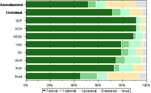 Kaikista äänioikeutetuista työllisiä on hieman yli puolet eli 51,6 prosenttia, työttömiä 7 prosenttia, opiskelijoita 8 prosenttia ja eläkeläisiä 25 prosenttia. Kolmella suurella puolueella: SDP:llä ja Kokoomuksella 92 ja Suomen Keskustalla 89 prosenttia työllisiä. Työttömiä ehdokkaita ei SDP:llä, Kokoomuksella ja Suomen Keskustalla ole juuri lainkaan. Opiskelija- ja eläkeläisehdokkaita suurilla puolueilla on vain 6 - 7 prosenttia. Eniten opiskelijaehdokkaita on Vihreillä ja RKP:llä.