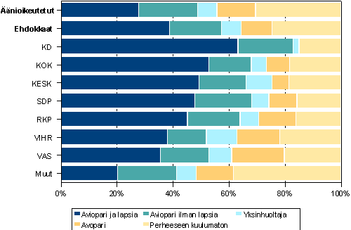 Suurten puolueiden ehdokkaista enemmistö elää aviopariperheessä: Suomen Keskustassa 66 %, Kokoomuksessa ja SDP:ssa 68 %. Avoliittolaisia on eniten SDP:ssä eli 10 %. Vihittyjen lapsiperheiden osuus on vähentynyt kaikilla puolueilla ja avoliittolaisten osuus kasvanut, samoin yksinelävien osuus.