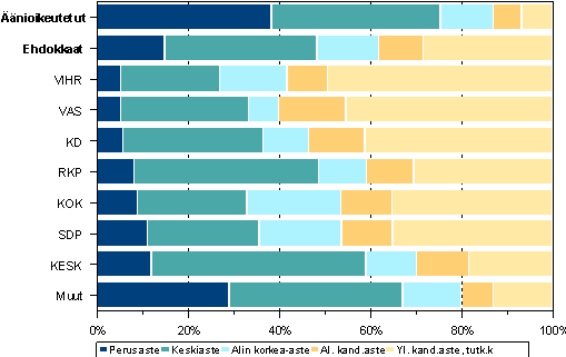 Eduskuntaan pyrkii korkeasti koulutettua väkeä. Lähes kaikkien puolueiden ehdokkaiden koulutustaso on parempi kuin väestöllä keskimäärin. Koko väestöstä perusasteen koulutuksen varassa on 38 prosenttia, mutta ehdokkaista vain 15 prosenttia. Suurten puolueiden ehdokkaista vielä pienempi osa on vain perusasteen koulutuksen saaneita: Vihreillä 5, RKP:llä 8, Kokoomuksella 9, SDP:llä 11 ja Suomen Keskustalla 12 prosenttia. Korkean asteen koulutus on yli puolella ehdokkaista, mutta äänioikeutetuista vain neljänneksellä. SDP:n ehdokkaista kolmanneksella on perusasteen tai keskiasteen tutkinto. Vihreiden ehdokkaista 73 prosentilla on korkean asteen tutkinto.