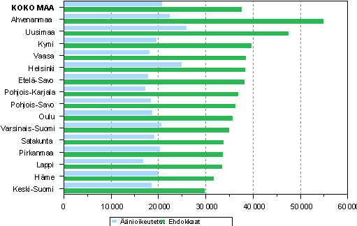 Äänioikeutettujen tulotaso on korkein Helsingin, Uudenmaan ja Ahvenanmaan vaalipiireissä, ehdokkailla parhaat tulot ovat Ahvenanmaalla ja Uudellamaalla.