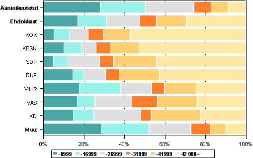 Kokoomuksen ja Suomen Keskustan ehdokkaista enemmistöllä on yli 42 000 euron tulot. 42 000 euron rajan ylittää 57 prosenttia Kokoomuksen ehdokkaista, 53 Suomen Keskustan, 44 SDP:n ja 43 prosenttia RKP:n ehdokkaista. Äänestäjäkunnasta vain 9 prosenttia ansaitsee yli 42 000 euroa. Tällä vaalikaudella yli 42 000 euroa ansaitsevien osuus on kasvanut etenkin Kokoomuksen ja Suomen Keskustan ehdokkailla.