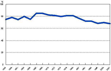 Voting turnout1) in Parliamentary elections in 1945 - 2007 (%)