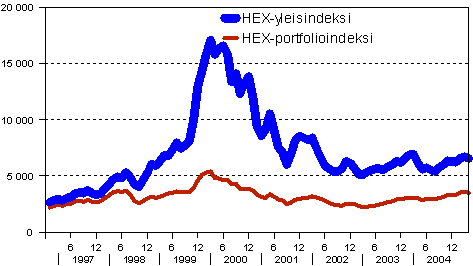 HEX -yleisindeksin ja portfolioindeksin kuukausikeskiarvot vuosina 1997-2005 (28.12.1990=1000)