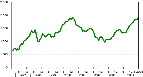 Pankit ja rahoitus -osakeindeksin kuukausikeskiarvot vuosina 1997- 2005 (28.12.1990=1000)