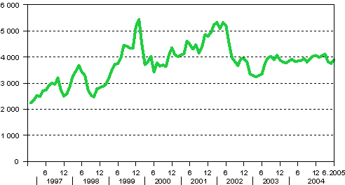 Metsä -osakeindeksin kuukausikeskiarvot vuosina 1997-2005 (28.12.1990=1000)