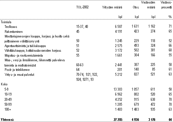 Tilastoyksikkö on yritys. Tietoja analysoidaan toimialaluokituksen ja yrityksen suurusluokan perusteella. Toimialajaottelu perustuu Tilastokeskuksen luokitukseen Toimialaluokitus 2002 (Tilastokeskus, käsikirjoja 4, Helsinki 2002). Käytetyistä toimialajaotteluista, tutkimuskohteesta ja tiedonantajista tarkemmin oheisessa taulukossa ja kohdan 2 menetelmäkuvauksessa.