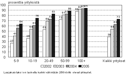 Keväällä 2005 laajakaistayhteys oli 73 prosentilla vähintään viisi henkilöä työllistävistä yrityksistä, kun vuotta aiemmin laajakaista oli 63 prosentilla yrityksistä. Laajakaista on yleistynyt nopeasti kaiken kokoisissa yrityksissä. Vuodesta 2002 laajakaistayhteyksien määrä on lisääntynyt kaikissa yrityksissä 34 prosenttiyksikköä ja pienissä 5-9 henkilöä työllistävissä yrityksissä 37 prosenttiyksikköä. Tuoreimmat tiedot on kerätty kyselytutkimuksella keväällä 2005.