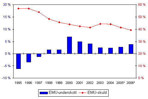 Enligt Statistikcentralens reviderade preliminära uppgifter uppgick den offentliga sektorns EMU-överskott till 6,4 miljarder euro år 2006, dvs. 3,8 procent av BNP, då siffran år 2005 var 4,3 miljarder euro, dvs. 2,7 procent av BNP. Den statliga sektorns överskott steg från föregående år med 0,6 miljarder euro till 1,5 miljarder euro. Kommunsektorns underskott minskade till 0,3 miljarder euro. Arbetspensionsanstalterna hade ett överskott på 4,9 miljarder euro. Övriga socialskyddsfonder visade ett överskott på 0,3 miljarder euro.