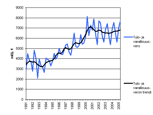 Tulo- ja varallisuusverokertymä (D5) neljännesvuosittain