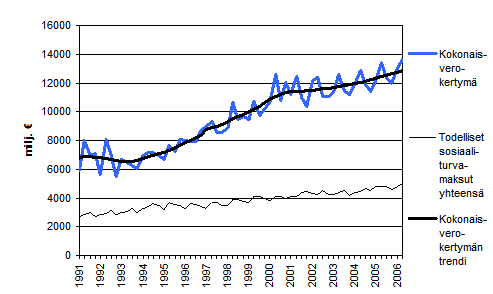 Julkisyhteisöjen kokonaisverokertymä sekä sosiaaliturvamaksut neljännesvuosittain 1998 - 2006