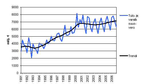 Tulo- ja varallisuusverokertymä (D5) neljännesvuosittain